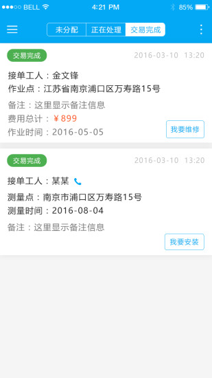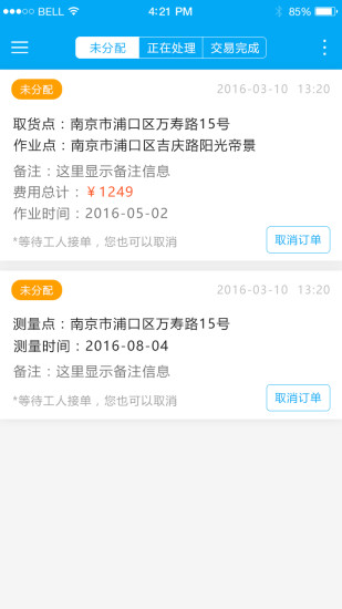 APP分为:经销商、工人两种角色。经销商发布一种订单,系统按照算法自动分配给工人接单。