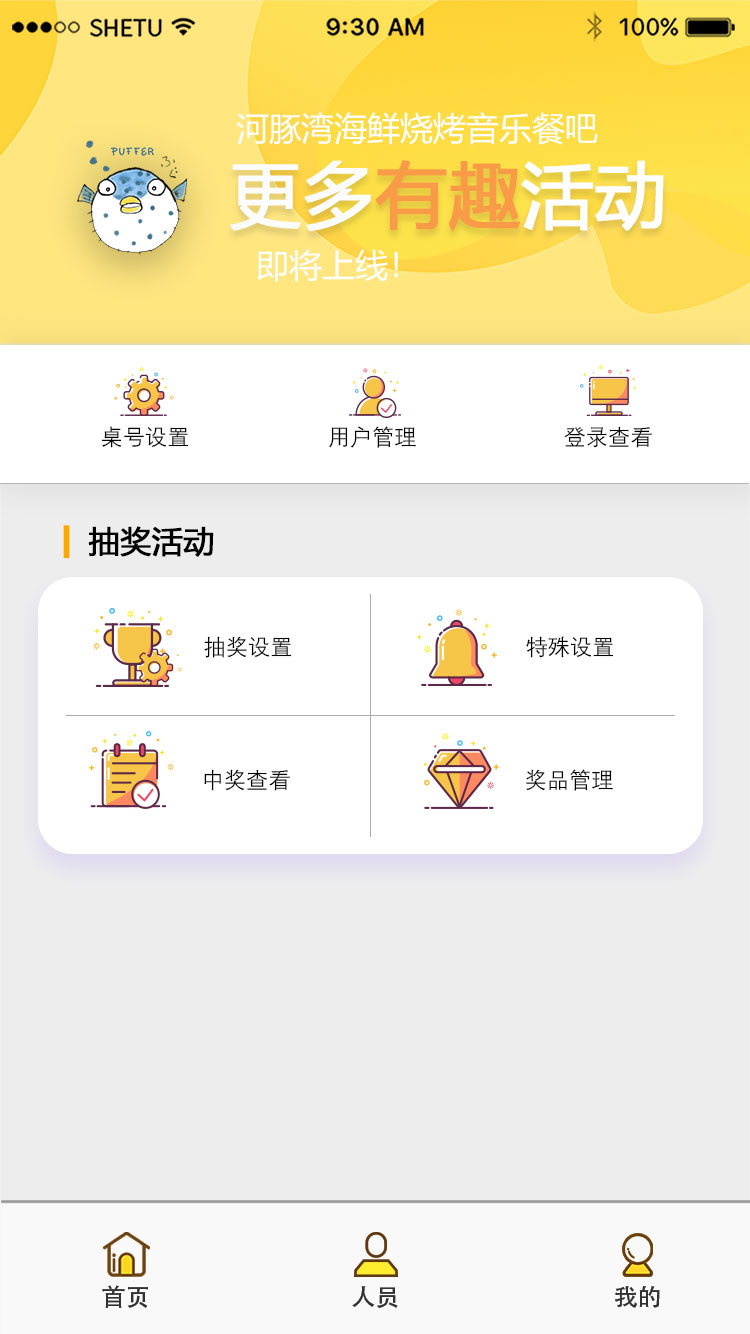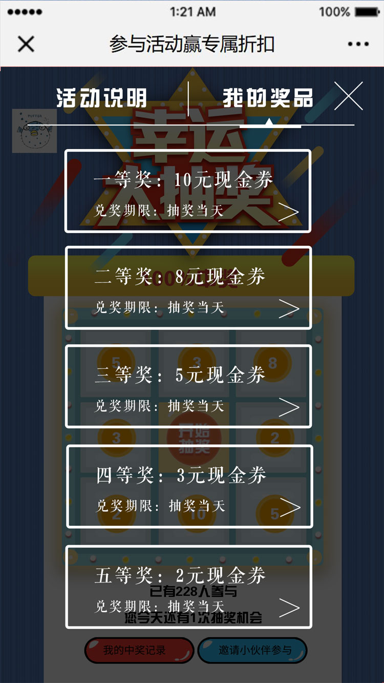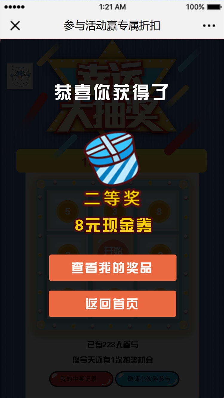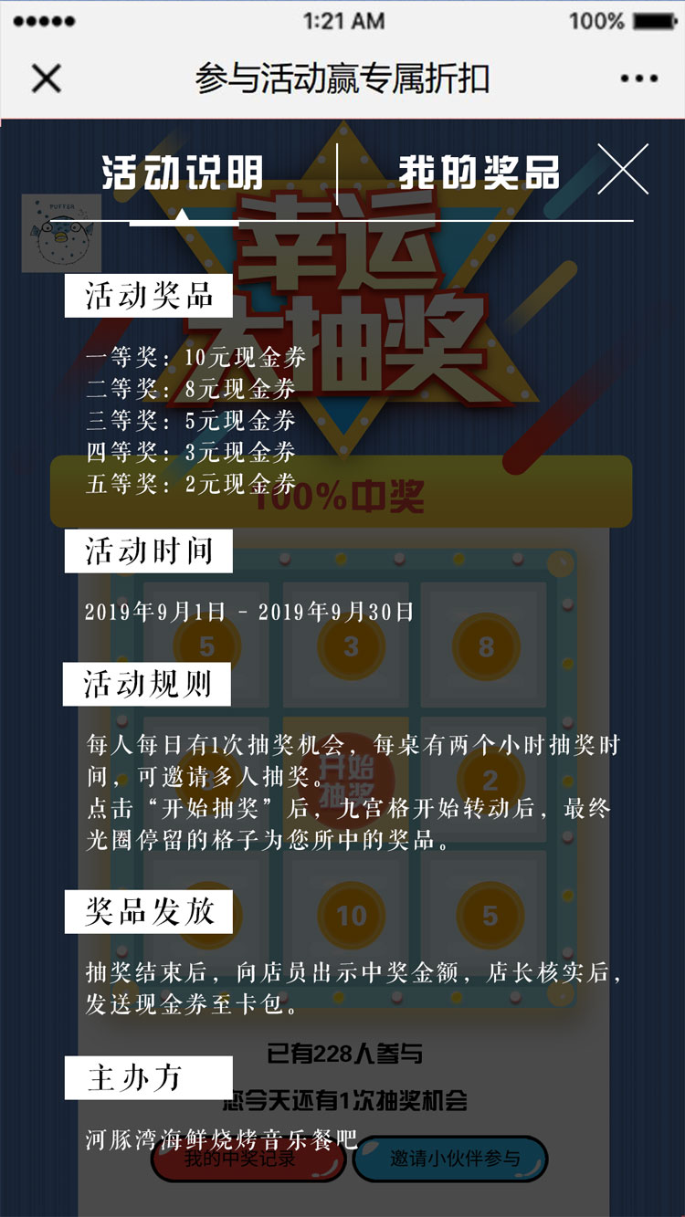 公众号为南京河豚湾餐饮店定制开发,用于活动宣传、员工奖励,功能包括:抽奖、分享助力、后台奖品设置、中奖管理等。