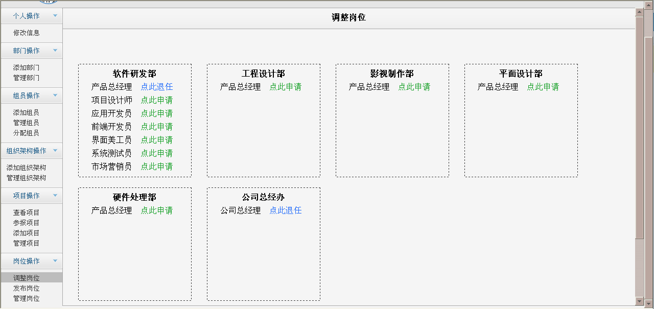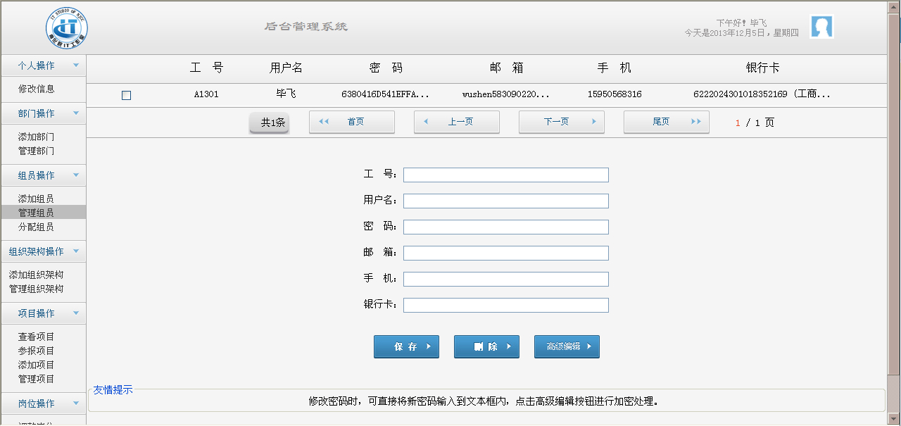 应用于南化院IT工作室的的管理系统,提供了信息管理、部门管理、组员管理、组织架构管理、项目管理、岗位管理等功能。